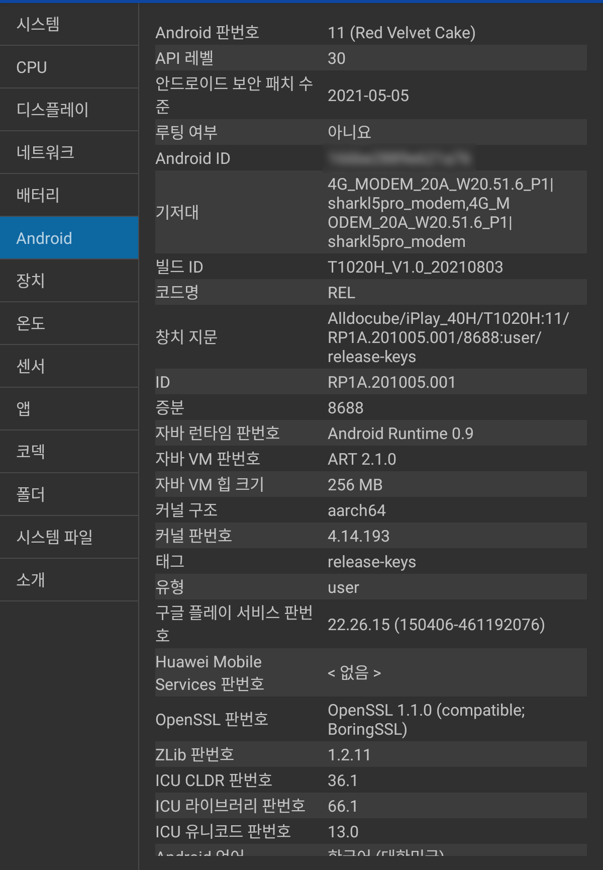 중국산 저가형 태블릿 3대장 시리즈들 중 하나인 iPlay40pro (모델명 : iPlay40H)의 하드웨어 사양