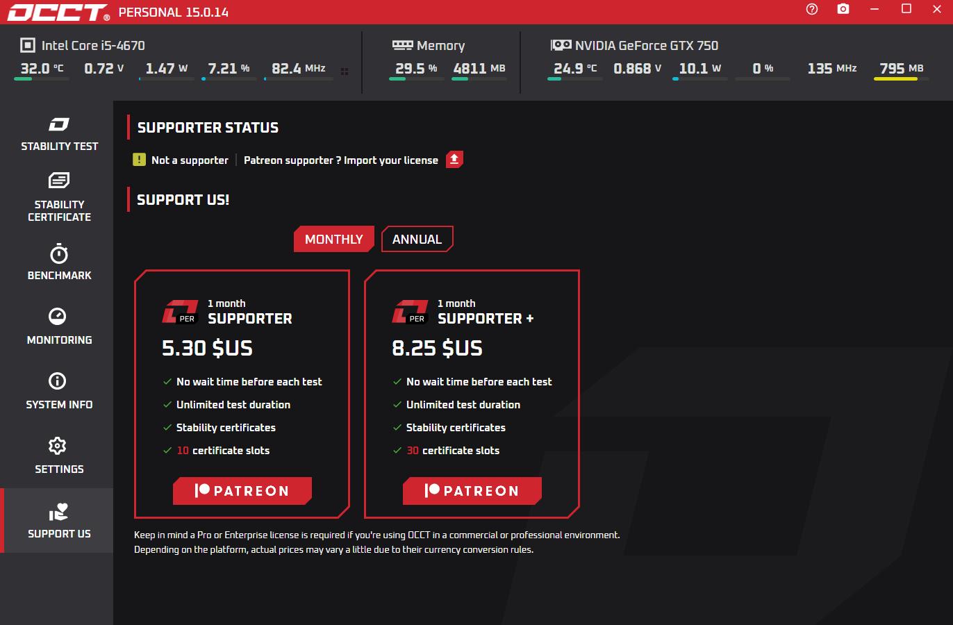 개인용 무료 버전은 핵심적인 스트레스 테스트 기능을 모두 제공하므로 일반적인 하드웨어 점검에는 부족함이 없다. 다만 다음과 같은 불편함이 존재한다.