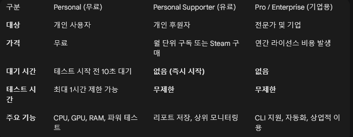 - 상업적 이용 불가: PC 수리점이나 조립 대행업체에서 고객 PC를 테스트하는 용도로 무료 버전을 사용하는 것은 라이선스 위반이다.